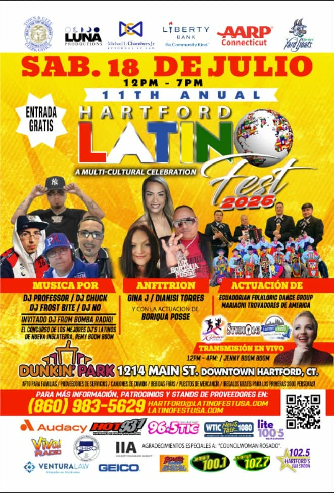 Join us for the 11th Annual Hartford Latino Fest at Dunkin’ Park on July 18 from 12:00 PM to 1:00 PM for a lively celebration of culture, community, and unity. This free, family-friendly event highlights the richness of Latino heritage through music, entertainment, and community engagement in the heart of downtown Hartford. Come experience the energy, connect with local businesses and organizations, and celebrate together at one of Hartford’s most anticipated cultural traditions.